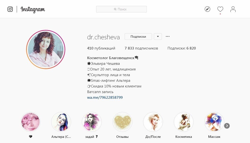 Хоть нас и предупреждали, что сферу красоты лучше не брать, я всё же решила попробовать. О клиенте: косметолог из г. Благовещенска.У клиента есть хорошо упакованный профиль в Инстаграм @dr.chesheva, поэтому трафик с рекламы вёлся именно туда. Аккаунт вел (и ведет по настоящий момент) администратор. Отличительные особенности косметолога: опыт работы 20 лет, наличие сертификата и бриллианта на аппарат Ultherapy (процедура омоложения). Косметолог попросила сделать основной упор на данную процедуру, т.к. аппаратов в городе было всего два. Бюджет рекламы: первоначально был 5 тыс. рублей, затем увеличили до 10 тысяч рублей. Цель: увеличение количества клиентов и продажа услуг. До начала работы Количество подписчиков составляло 7833 чел. Использовалось бесплатное продвижение - массфолловинг. Ранее они пробовали запускать таргетированную рекламу, результаты были хорошие, но тратили на запуск рекламы не больше 3 тыс. руб. Запись на услуги была, но косметолог хотела увеличить количество клиен