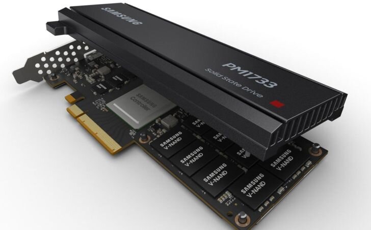 вообще не проблема. Как оказалось, что скорость в 5 ГБ/с – это первые шаги. Южнокорейский гигант Samsung продемонстрировали самый быстрый в мире SSD накопитель PM1733, скорость передачи данных которого составила 8ГБ/с. Стоит упомянуть, что новинка ориентирована на серверный рынок. Возможно уже в следующем году выйдут аналогичные устройства для обычных пользователей. В новом твердотельном накопителе, Samsung использовали контроллер собственной разработки и память TLC V-NAND. PM1733 выйдет в двух вариантах: U.2 и HHHL. Объём версии U.2 составит 30,72 ТБ и 15,36 ТБ у версии HHHL. Показатель по операциям с произвольным доступом достигает невероятных 1500000 IOPS