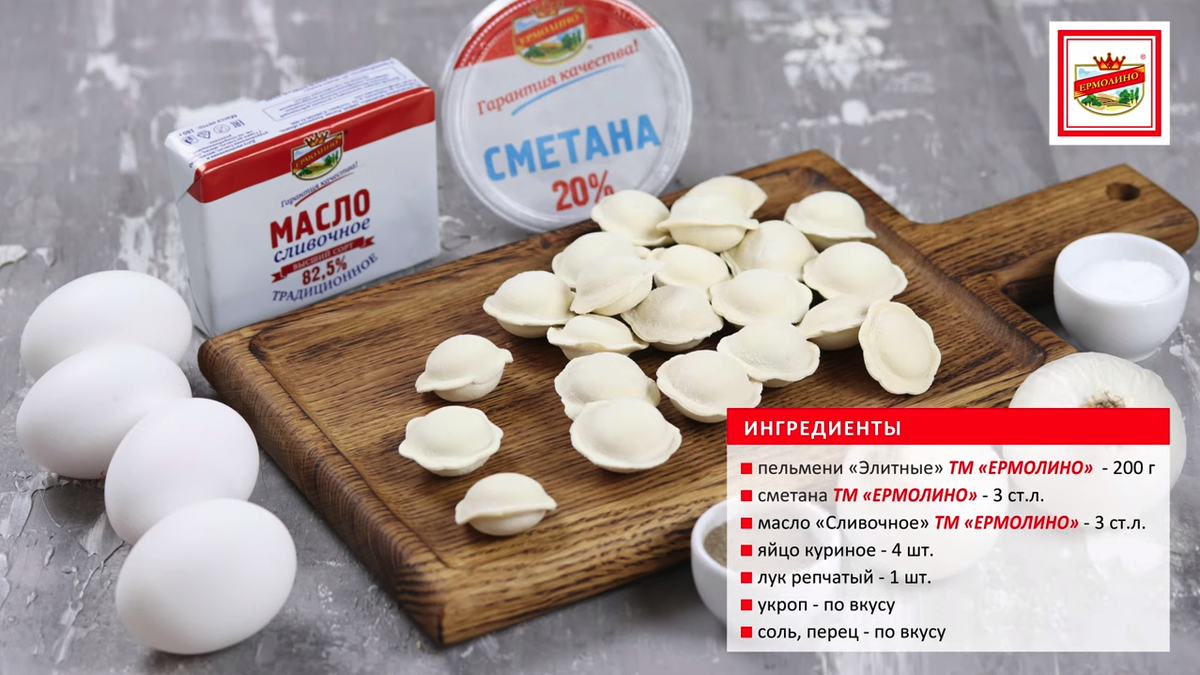 Такой рецепт Вас точно удивит! Как Вы готовите пельмени? Варите, жарите, запекаете в духовке, готовите пельмени в горшочке? А мы приготовили пельмени в омлете - рецепт простой, и необычный. Сытно и вкусно, а готовится быстро. Попробуйте! Самое главное в этом рецепте - пельмени. Попробуйте фирменные пельмени "Элитные" со свининой и говядиной ТМ "ЕРМОЛИНО". В их составе - фарш из отборного мяса свинины и говядины с добавлением сливок, поэтому фарш получается нежным и очень сочным! Эластичное тесто приготовлено из муки высшего сорта с добавлением растительного масла, а сами пельмени вылеплены в форме цветка. По всем параметрам они соответствуют своему названию "Элитные"! Как готовить: 1. Яйца, сметану ТМ "ЕРМОЛИНО", соль и перец взбейте венчиком до однородной массы. 2. Лук нашинкуйте и обжарьте до золотистого цвета на сливочном масле ТМ "ЕРМОЛИНО" . 3. Добавьте пельмени "Элитные" и пожарьте их с двух сторон до румяной корочки. 4. Залейте сверку сметанно-яичной смесью и готовьте до ее заг