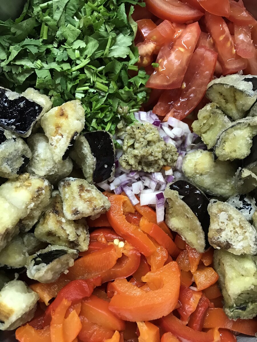 Запечённые овощи🍅🌶 , хрустящие баклажаны🍆, ароматы кинзы , красного лука и кунжута - салат 🥗, который замечательно подойдёт к стейку 🥩 и бокалу красного сухого вина🍷 🛒 Ингредиенты: 📝 Технология приготовления: 1️⃣ Включаем духовку на 180 градусов, пока она разогревается моем болгарский перец 🌶 и натираем небольшим количеством оливкового масла. Затем каждый перчик заворачиваем в фольгу и отправляем запекаться на 25 минут. 2️⃣ Пока перцы томятся в духовке мы займёмся баклажанами 🍆. Сначала нарезаем 🔪 баклажаны на круги шириной около 2 - 2,5см, затем каждый из них режем на 4-6 частей. Не мельчите , кусочки должны быть достаточно крупными. ❕Вы можете очистить баклажаны от кожуры, так они получатся более нежными внутри и хрустящими снаружи ❕Нарезанные баклажаны складываем в целлофановый пакет , туда же высыпаем крахмал, надуваем воздухом, завязываем и хорошо перемешиваем. 3️⃣ 🔥 Разогреваем в сотейнике кунжутное масло и частями обжариваем в нем баклажаны 🍆обваленные в крах