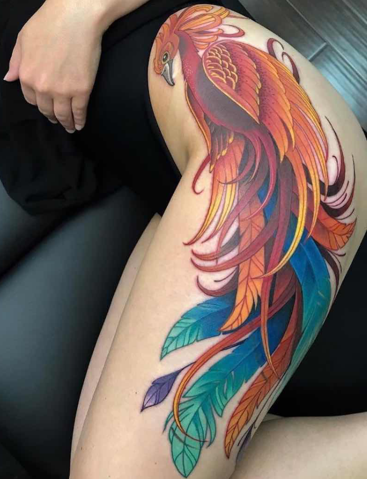 Анатомия Тату № 1 в рейтинге Москвы -http://rating.msk.ru/tatoo/anatomiya_tattoo/ Татуировка жар-птица – яркая, смелая, привлекающая внимание окружающих. Персонаж, знакомый каждому с детства, обещавший чудеса, волшебство, исполнение желаний. Татуировка с изображением жар-птицы в равной степени нравится мужчинам и женщинам, на ней часто останавливают свой выбор молодые девушки, уже вышедшие из подросткового возраста, но еще мечтающие о чудесах и сказке в реальной жизни. Тату жар-птица, как правило, выполняется в цвете, можно сделать татуировку на плече, лопатке, возле ключицы, на запястье, на щиколотке, ягодице, внизу живота или на пояснице. Что означает татуировка жар-птица? Значение татуировки жар-птица напрямую связано с ролью этого сказочного персонажа в жизни героев, которым выпадало счастье ее поймать. Жар-птица сулила богатство, успех, славу, любовь и решение всех проблем одним взмахом крыла. Так и татуировка жар-птица, значение которой заключается в приобретении своеобразно