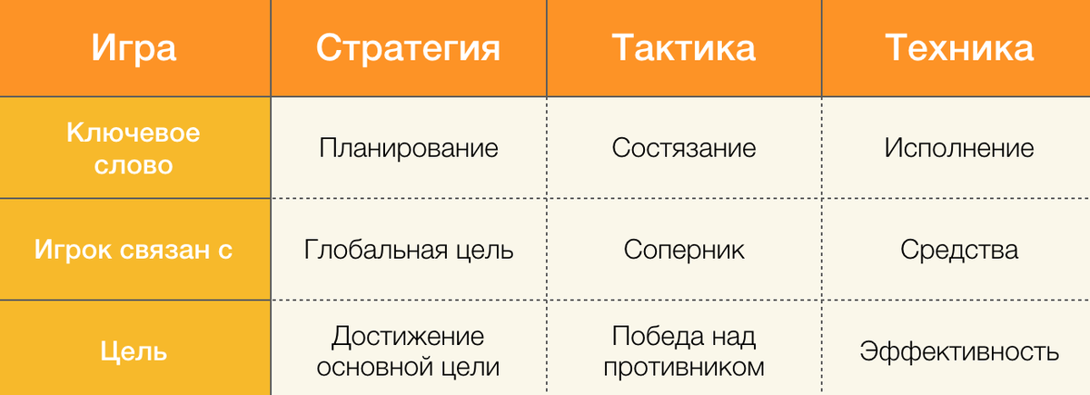 Пример: пробивая пенальти мы используем способ его исполнения (технику), чтобы забить гол (тактическая задача), что позволяет нам выиграть (стратегическая цель).