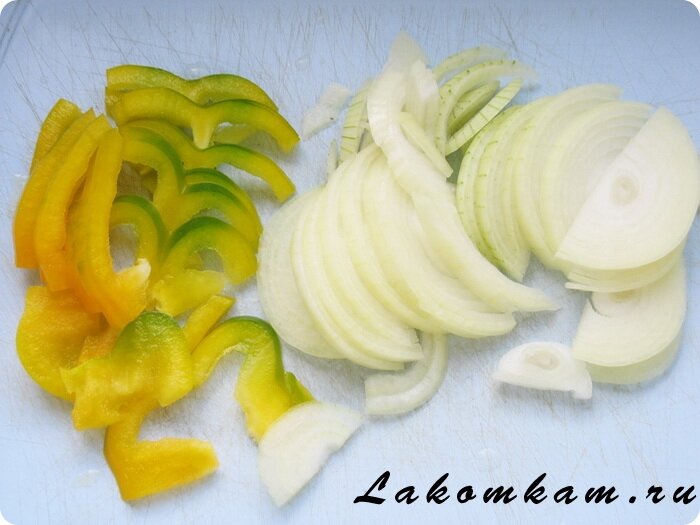 Приготовление омлета закусочного. Овощи почистите и вымойте. Лук нашинкуйте тонкими полукольцами, сладкий перец нарежьте брусочками.