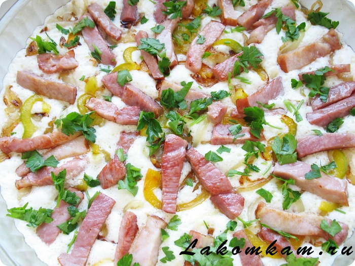 Ингредиенты: яйца — 4 штуки; сметана — 2 столовые ложки; майонез — 2 столовые ложки; лук репчатый — 1 штука; половина свежего сладкого перца; ветчина — 100 грамм; сыр — 50 грамм; петрушка; соль, перец.