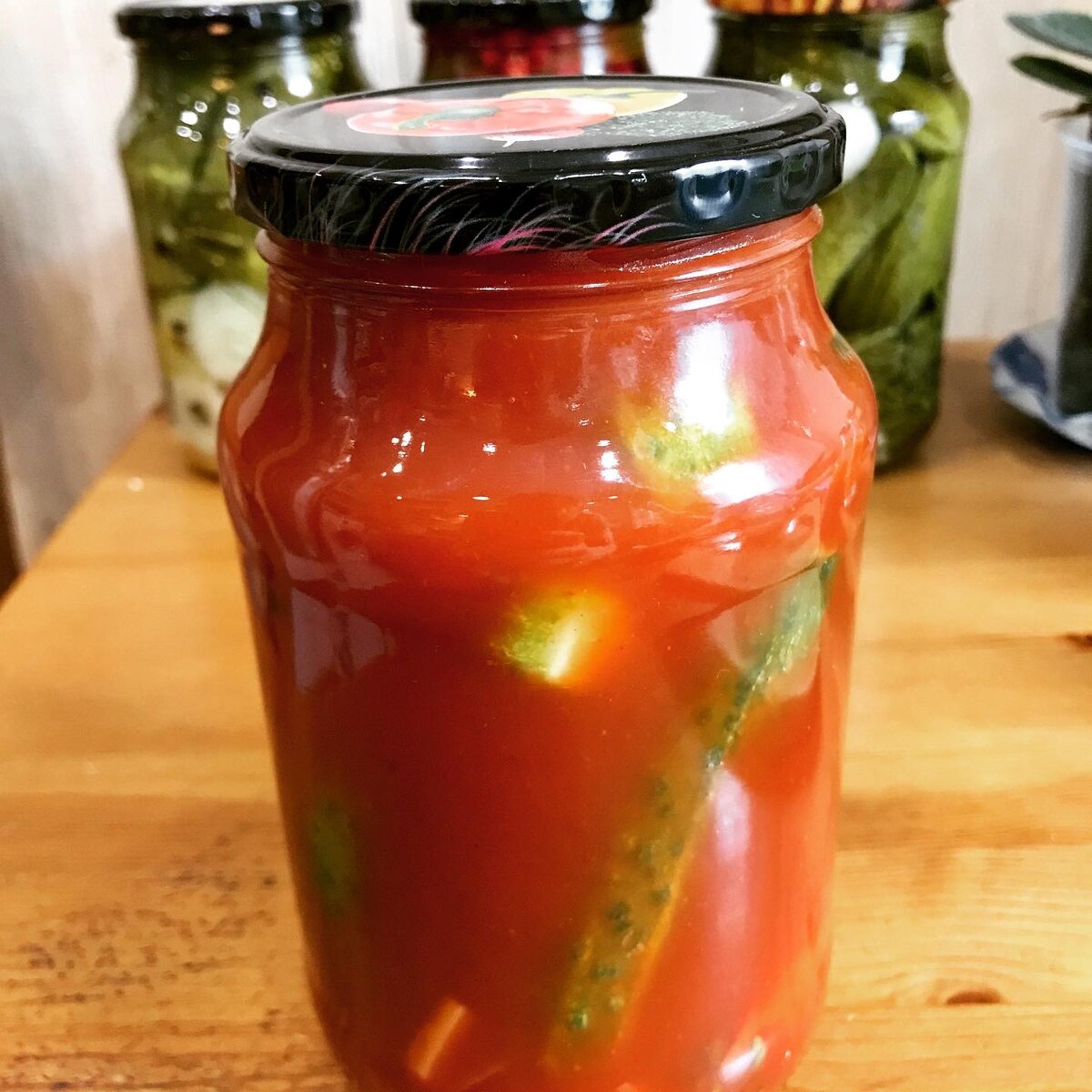 Здравствуйте, уважаемые гости и подписчики! Пользуясь случаем, что наконец-то, очень поздно, пошли огурцы, уделяю им особое внимание, ведь уже вот-вот их не станет Сегодня для вас ещё один интересный способ - огурцы маринованные в томатной заливке Как обычно все пропорции - в конце статьи! Вот всё и готово! Быстро, просто, вкусно и необычно! Огурчики таким способом получаются пикантные, кисло-сладкие, с выраженным томатным вкусом и очень ароматные! Подавать к столу лучше в заливке. А сам маринад ещё можно использовать например, при приготовлении курицы или мяса, к овощным блюдам! Попробуйте - очень вкусно! Теперь о пропорциях и тонкостях: Ещё раз повторюсь - это на литровую банку! Соль - столовая ложка, можно с горкой, если любите посолонее Сахар - 2 столовых ложки с горкой Уксус 70% (эссенция) - 2 чайных ложки Чеснок - 3-4 зубка, зависит от размера и остроты Острый перец - стручок сантиметров 5-6, надо, конечно, почистить! Лук - половина небольшой луковицы Корень хрена - где-то с пале
