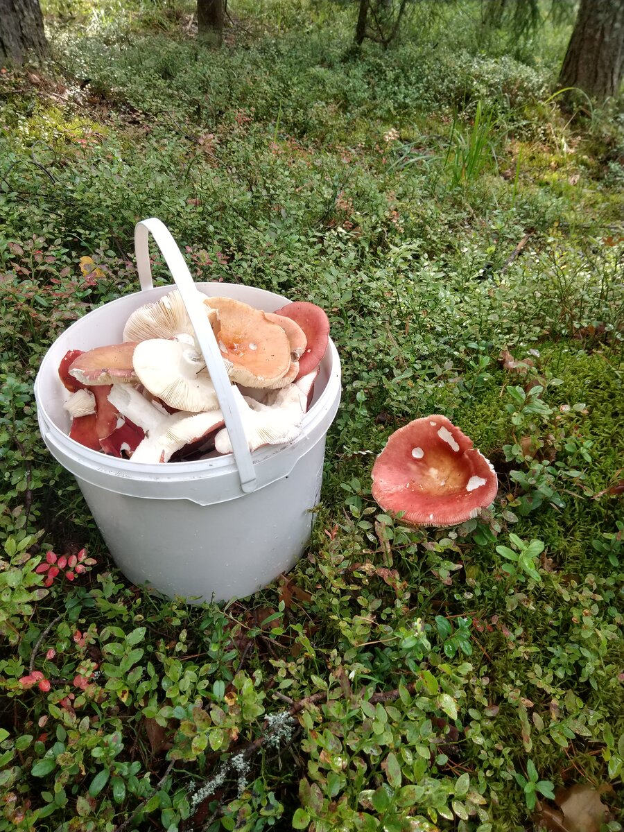 Вчера проводили разведку. Набрали подберёзовиков, подосиновиков и белых, немного маслят. А ещё вокруг видели просто море сыроежек, но благоразумно решили оставить на следующий раз, потому что они просто до дома не доедут - хрупкие, заразы. И вот утречком рванули мы в лес. Спрашивается: мало мне? Ну это жадность, да. Сыроежек набрала ведро (15-литровое, оно на фото). Могла добрать сыроежками и корзинку с остальными грибами, но устала. Муж куда-то ускакал, а мы с тётушкой отправились домой. А тут и супруг подоспел - с корзиной груздей... А делать нечего, села перерабатывать. И в первую очередь - сыроежки. Нарезала, промыла, отварила. Ещё раз промыла. Даже лопухи чистые. Мало червивых, а вот слизни жрали знатно. Когда грибочки остыли, а вода стекла, запустила варить их уже основательно. Соль по вкусу, горстку горошин чёрного перца. Муж крутился рядом, заглядывал через плечо. Слюни ронял. Хотела сварить в уличной печке, но началась такая гроза, что мы позорно бежали домой с кастрюлями. По