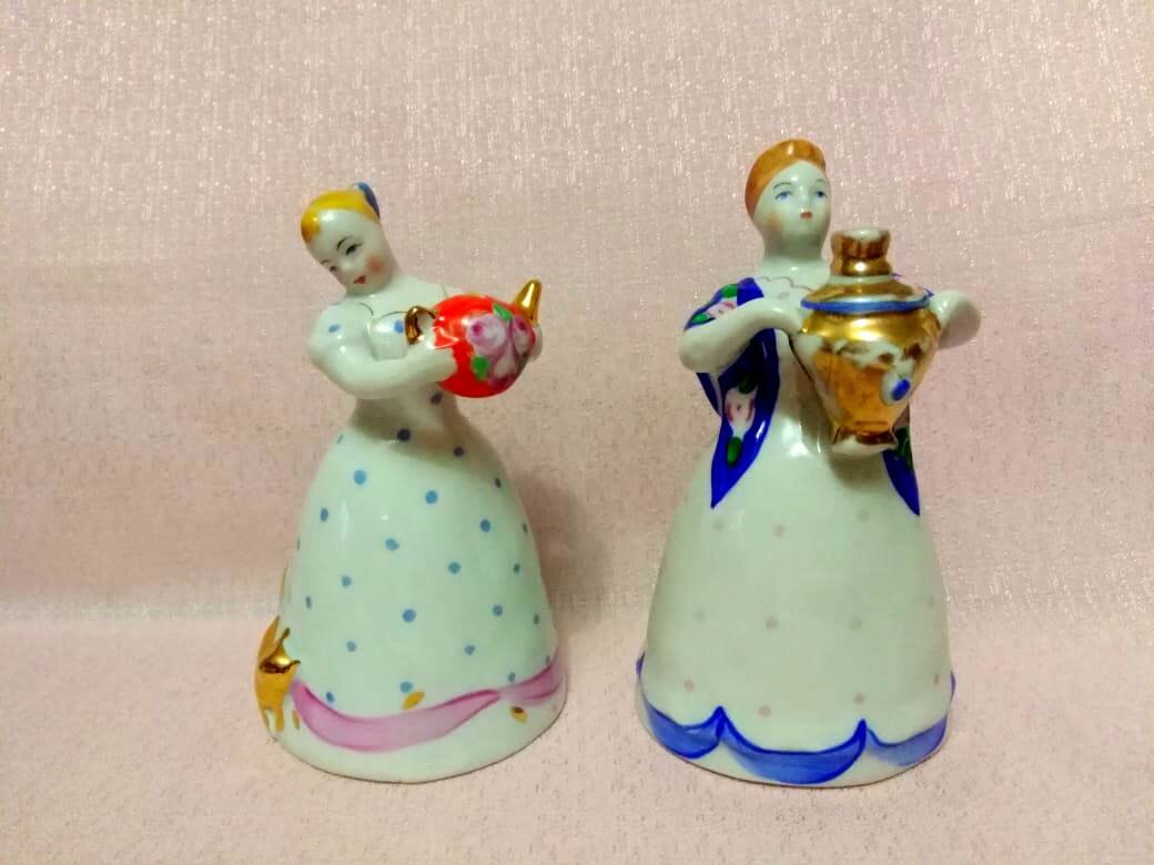 Фигурки из серии «Семейное чаепитие». Скульптор Н. Малышева. Высота девушки с самоваром – 12, 5 см, а девушки с чайником – 12 см. Клеймо надглазурное, датируется 1968годом. Девушка с самоваром бывает еще в более скромной росписи - платок просто однотонного желтоватого оттенка, в цвет волос. У моей же красавицы платок ярко-синего цвета и расписан розами в ручную. У второй барышни расписан только чайник и, насколько мне известно, это единственный вариант росписи. У обеих девушек очень приятные и нежные лица. Глядя на них, так и хочется попить чайку в уютной домашней обстановке. Очень домашние и семейные скульптуры. Вообще Н.Малышева была одним из ведущих скульпторов на Дулевском Фарфоровом Заводе и много создала красивых и характерных вещей.