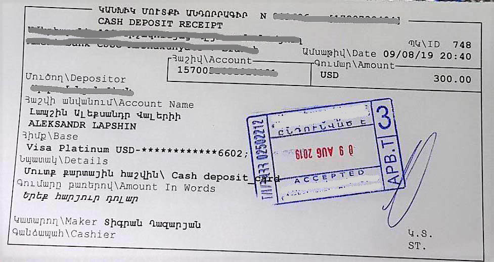 А потом они мне скинули эту сумму на счет в банке. Вопрос возник на какой счет и в каком банке скидывать? Там все переводы в долларах США и оказалось, что единственный долларовый счет который у меня есть, это... в армянском банке. Сам удивился, поскольку держу счета в банках Израиля, России и Бельгии. Но вот долларовый счет оказалось только один. Были бы транзакции в рублях, то дал бы им реквизиты моего счет в Сбербанке России, где счет рублевый. Были бы в евро - дал бы им мой счет в Бельгии. Короче говоря, вот -