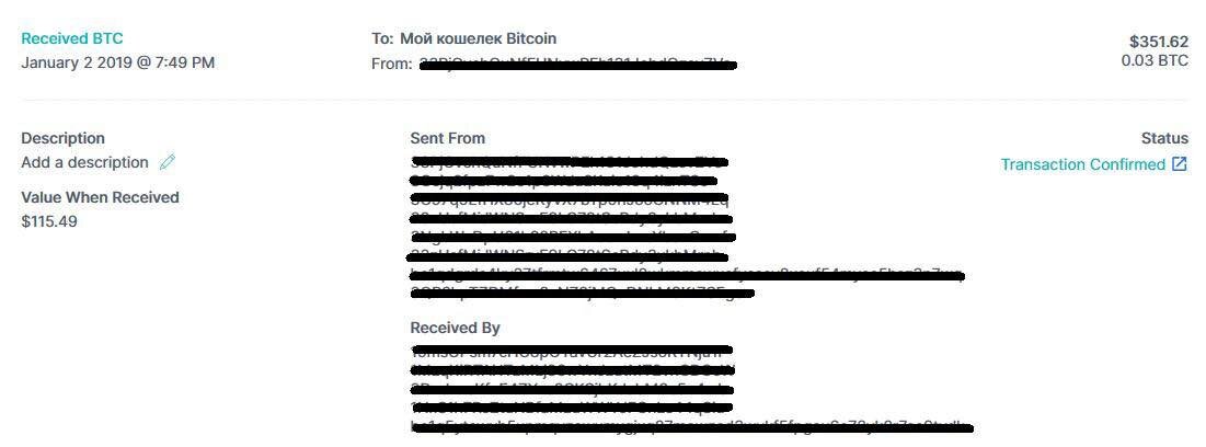 Пока на прошлой неделе, уже в августе 2019-го, друзья мне написали, что Биткоин вырос ВТРОЕ, и самое время вывести деньги. Если, конечно, я хочу. По крайней мере, они решили вывести свои деньги. Без вопросов, выводим! Транзакции с Биткоинами выглядят как длинные ряды букв и цифр, обозначающие кошелек и транзакции по кошельку за этот период времени. Там указано, что в январе 2019 были куплены биткоины на 115 долларов (слева), а сейчас сумма превратилась в 351 долларов (справа вверху). Соответственно, они дали поручение брокерской компании вывести деньги -