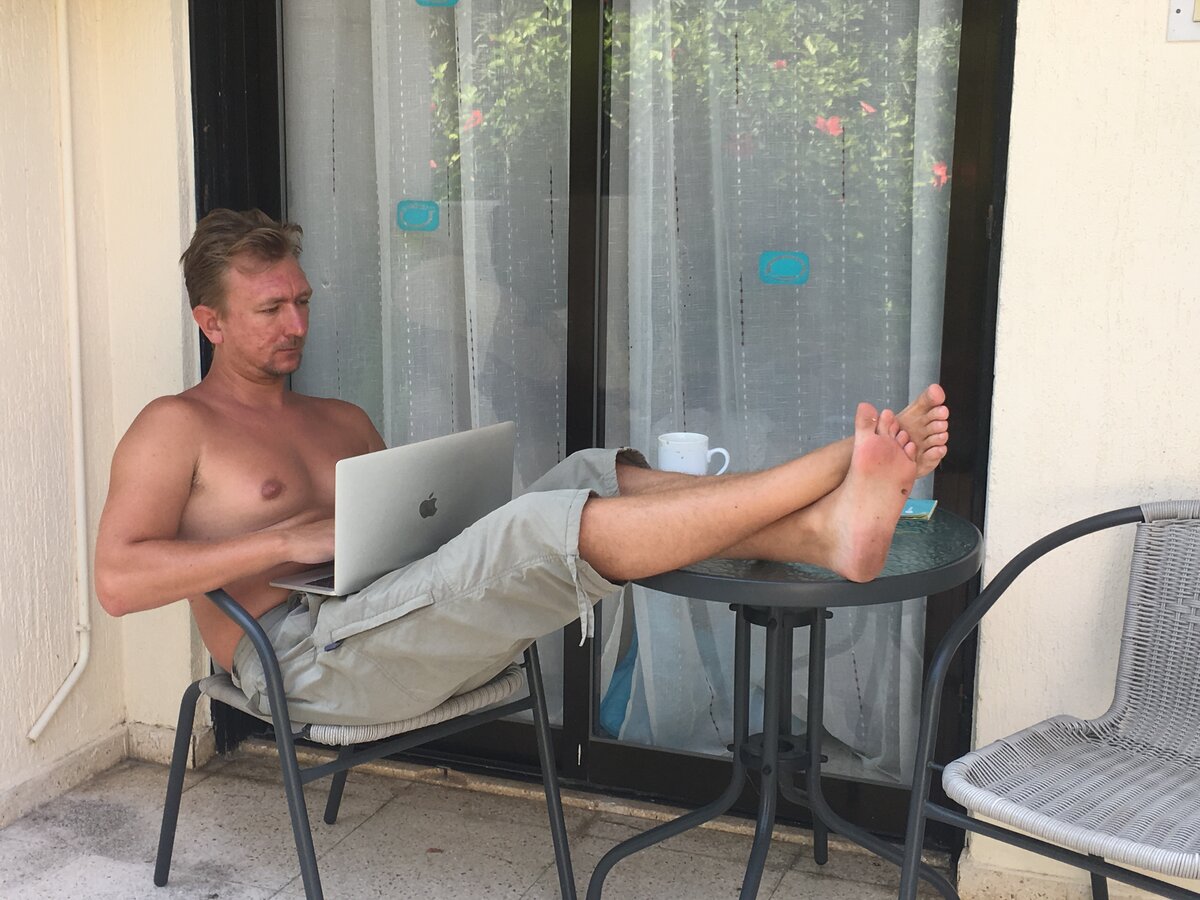 Специально сделал эту фотку во время нашего двухмесячного летнего отдыха на Кипре. Все это полная фигня, ребят. Интернет еле-еле тянет, чтобы открыть вконтакт. Солнце отсвечивает от экрана, ничего не видно (даже на Маке). Да и Мак этот не мой, а моей жены )) Сделал ей подарок в прошлом году. А сам до сих пор «виндовозю», как любой нормальный старпёр )) Я даже стишок придумал – «На винде сидит старпёр,