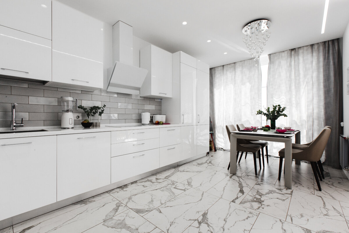 Акцент на столешнице. Толщина не равна прочности: столешницы из гранита, кварцевого агломерата, керлита или крупноформатного керамогранита выдержат падение кружки, тяжелую сковороду и удар соскользнувшего с разделочной доски ножа. А для тотально белой кухни подберите столешницу из кориана или стекла.