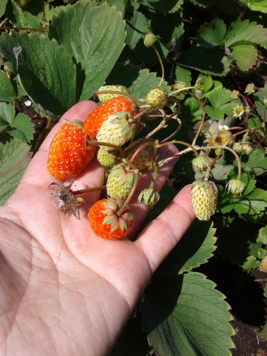 Весной, где-то в середине мая, я взяла у знакомой бабушки штук 10 отростков ремонтантной клубники. Сорт очень старый, название она давно уже забыла. Так как май был у нас жарким и засушливым, принимались они трудно, долго. Первые ягодки были мелкие, но сладкие. Когда стали ползти усы, появились и новые бутоны. Я старалась удалять усы, но потом было не до этого и они расползлись. Самое интересное в этом сорте, что он плодоносит непрерывно. И сейчас в середине августа еще много бутонов. Ягоды появляются сразу же на усиках, даже не укорененных. Каждый день с этой грядочки я собираю горсти две ягод. Не много, но напомню, что посадила их только весной. Детям покушать хватает. Надеюсь на следующий год урожай будет больше. Обычно ягоды пересаживают в августе. Но мои не вариант пересаживать сейчас, потому что они ещё плодоносят. Я сделала так. Собрала невысокие контейнеры из под тортиков, наполнила их землёй. Затем выкопала рядом с клубничной грядкой ямку и поставила в нее тортницу. Если н