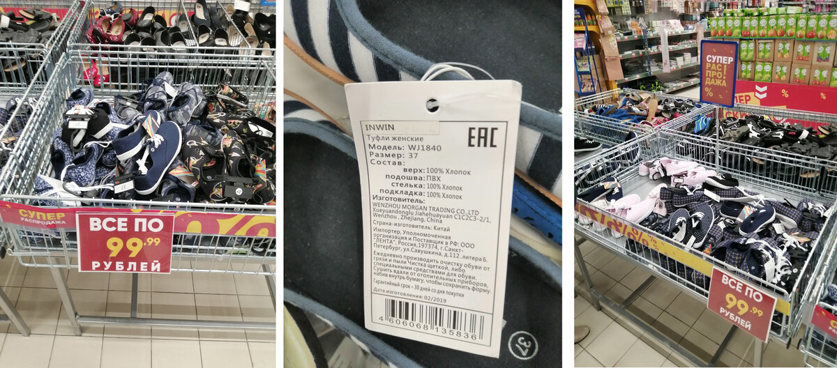 Заканчивается лето, а в «Ленте» продолжается распродажа летних коллекций. Многие товары можно купить по минимальным ценам. Например, кеды – всего 99 рублей – и они ваши. Расцветки разные, сделаны из хлопка. Можно выбрать и недорогие шлепки, сланцы, босоножки, сандалии – цены от 99 до 299 руб, но понятно, что за такие деньги обувь, в основном, из искусственных материалов, за исключением туфлей из хлопка. Цены на кроссовки – от 499 рублей. По низким ценам можно купить и летнюю одежду. Женские шорты стоят от 99 рублей до 500 рублей. Дешевые модели разбираются довольно быстро. В ассортименте майки, футболки. По выгодным ценам можно и приобрести легкие летние брюки. Есть несколько моделей платьев на шнурке. Недорогих летних вещей в «Ленте» много, они пользуются спросом, сотрудники, как это часто бывает, не успевают сортировать вещи, класть на место. Ценники не всегда соответствуют товару, потому перед покупкой цену все-таки лучше проверять и уточнять. Помимо большой распродажи вещей, поку