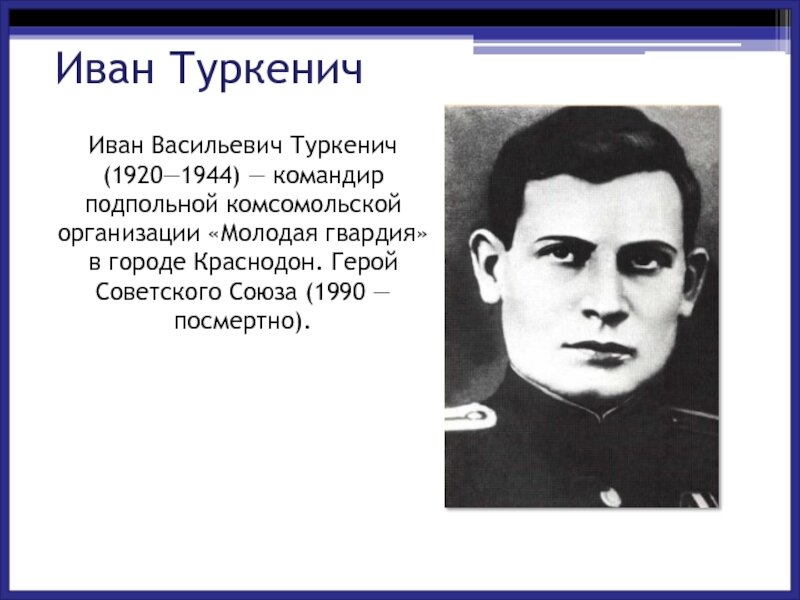С лета 1942 года лейтенант Иван Васильевич Туркенич на фронте в должности помощника начальника штаба 614-го истребительно-противотанкового полка. В августе 1942 года в одном из боёв на среднем Дону в ходе Сталинградской оборонительной операции Иван Туркенич был ранен в руку. Обороняясь на берегу одной из безымянных речушек, артиллеристы стояли до последнего снаряда и патрона. Обливаясь кровью, Туркенич действовал за наводчика. Когда кончились снаряды, все взялись за гранаты. Лейтенант Туркенич был вторично ранен, держался, пока не потерял сознание. Очнулся Иван в фашистском плену. Несколько дней спустя на одном из этапных привалов ему удалось обмануть конвоиров и убежать. Глухими дорогами в ночное время он пробрался в Краснодон. В хорошо знакомом городе Туркенич рассчитывал укрыться от фашистских ищеек и спокойно обдумать свои дальнейшие действия. Но без дела долго сидеть не пришлось. Шахтёрский Краснодон не хотел подчиняться оккупантам. По поручению руководителя большевистского