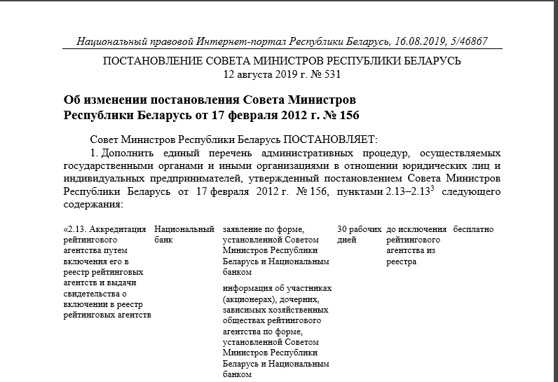 Нацбанк наделили полномочиями по государственному регулированию рейтинговой деятельности в Республике Беларусь в феврале текущего года соответствующим указом. Единый перечень административных процедур, осуществляемых государственными органами и иными организациями, пополнился действиями "Аккредитация рейтингового агентства" , которые совершает Национальный банк : за 30 дней и бесплатно. Опубликованное постановление Совмина вступит в силу с 1 января 2020 года. Внутренний рынок корпоративных облигаций давно заждался оценок профессиональных экспертов по кредитным рискам эмитируемых инструментов. Ждем как минимум появления дочек одного из рейтинговых агентств , работающих на российском рынке долгового капитала.