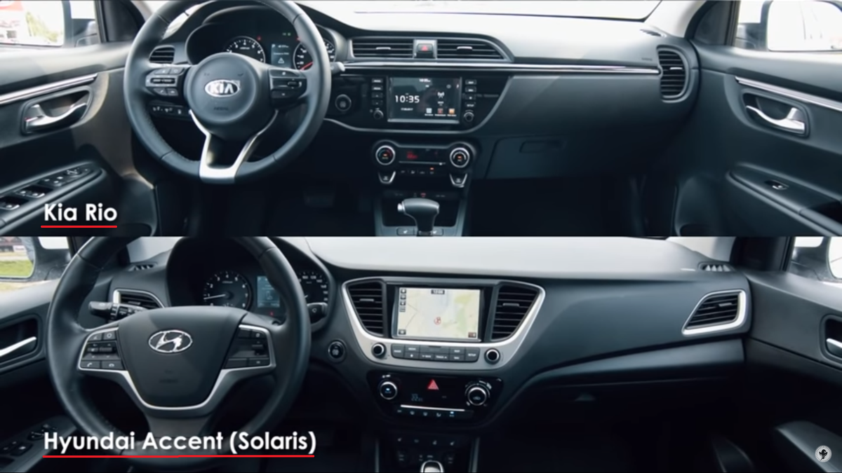 этот интерьер более экспрессивный, более стильный. Здесь больше дизайна, больше лихих решений, и больше декора. Кол-во каких-то там декоративных и блестящих элементов салона определенно выигрывает. Шикарная накладка на рулевое колесо, молдинг который проходит по дверям, только по передним дверям. У solaris ничего подобного нет. Нет таких мелочей. Глянец, конечно, меня немножко смущает, в силу того, что на нем все пылинки видны, и соответственно видны отпечатки пальцев. Кроме того, вот эти вот физические кнопки, которые расположены на глянце, мне кажется, немножко так чужеродное здесь выглядят, не вписываются. На мой взгляд, центральная консоль в солярис сделана более рачительно, более функциональней и практичней. Пульт управление климат-контролем в Рио сделан просто шикарно, причем вес, дизайн не пошел в ущерб функциональности, то есть все на виду. Назначения каждой кнопки понятные,