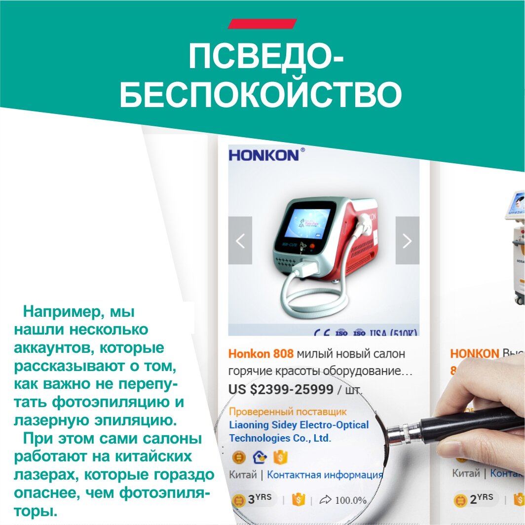ПСВЕДО-БЕСПОКОЙСТВО Хорошие новости! Посты о лазерном обмане набирают популярность, а сами студии предупреждают своих клиентов об опасности. Мы рады такой активности, но зачастую за ней скрывается что-то другое... Например, мы нашли несколько аккаунтов, которые рассказывают о том, как важно не перепутать фотоэпиляцию и лазерную эпиляцию. При этом сами салоны работают на китайских лазерах, которые гораздо опаснее, чем фотоэпиляторы. Как говорит народная пословица: "В чужом глазу соринку видишь, а в своем бревна не замечаешь" Напоминаем, что и среди диодных лазеров есть опасные аппараты с нестабильными диодами, которые способны причинить вред здоровью. Поэтому не переставайте быть внимательными, даже если студия делает вид, что беспокоится о вас.