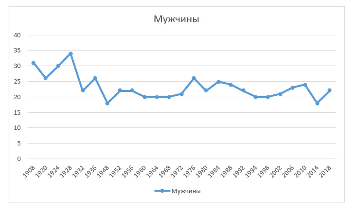 Недавно мне стало интересно, как сильно менялся возраст победителей Олимпийских игр в фигурном катании с течением времени. Сейчас очень много рассуждений на тему того, что фигурное катание очень помолодело, и победителями становятся всё более юные спортсмены. Я решила провести небольшое исследование и выяснить как обстоят дела на самом деле. Мужское одиночное катание. Начнём с представителей сильной половины человечества. Я составила график, на котором обозначила возраст победителей Олимпийских игр начиная с 1908 и заканчивая 2018 годом. Как можно заметить из графика, самым "старым" чемпионом Олимпийских игр среди мужчин является 35-ти летний фигурист представляющий Швецию - Гиллис Графстрём. Гиллис трижды становился победителем игр с 1920 по 1928. Держателем рекорда самого молодого олимпийского чемпиона уже 71 год является американский фигурист Ричард Баттон, который стал победителем игр 1948 года прошедших в Санкт-Морице в возрасте 18 лет и 202 дней. Чуть-чуть до рекорда Ричарда не