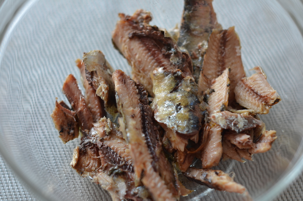 1. Сардину переложить из банки в глубокую емкость и хорошо размять вилкой.