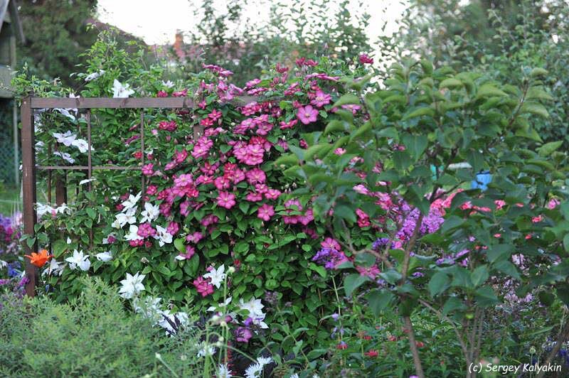 12 лет тому назад, когда Владимир Федоров купил дом в садовом поселке под Гатчиной, о саде он и не думал. А сейчас это цветущий рай! На участке, который упирался в лес, были разбиты небольшие овощные грядки, росли рябины, сирени, ягодные кустарники и две огромные старые ели. Однако спустя несколько лет, когда работы по обустройству интерьера закончились, появилось желание изменить и дачный ландшафт. Уютному дому требовался цветущий сад. Сад создавали, переделывая кусочек за кусочком то, что досталось в наследство от старых хозяев участка. Прямые, как стрела, мощеные дорожки были расположены вполне практично, поэтому их решили не трогать. Как и монолитную бетонную плиту фундамент, оставшийся от гостевого дома ровно по центру участка. Его, конечно, хотелось убрать, но затраты на демонтаж превысили бы все допустимые пределы. Поэтому воспользовались золотым дизайнерским правилом: «если не можешь спрятать – выставляй напоказ». И оборудовали многоуровневые приподнятые цветники, а плиту з