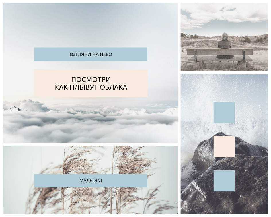 Мудборд — визуальное представление дизайн-проекта, которое состоит из изображений, цветовой палитры и пр. Он передает общее настроение, стиль и направление. Все элементы разместите в виде коллажа. Мудборд поможет отсечь лишнее и всегда придерживаться единого оформления.