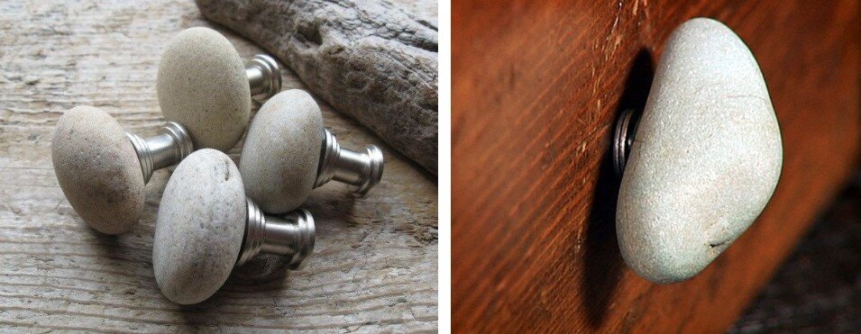 Такая поделка подойдет как ручка для любой баночки, или даже кухонных шкафчиков. Возьмите обычный камень, или может какой-то значимый для вас, привезенный из путешествия, поместите его на какую-нибудь поверхность, от которой не жалко будет избавиться и покройте изделие лаком. После того, как поделка полностью высохнет, приклейте ее к поверхности, для которой она будет служить ручкой. Если камень красивый сам по себе, то красить его не обязательно.