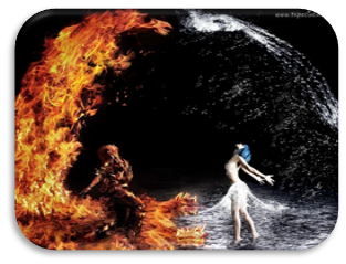 И наступило временное затишье. Огонь оставался на Солнцах, а Вода – в океанах. Но бездействие всегда утомительно. И однажды им обоим на ум пришла такая мысль: - Это, конечно, здорово, что я могу, как угодно менять свою форму, но неплохо было бы иметь образ, который будет только моим, в котором я выражу свою суть. И они стали придумывать себе образы. С той поры Вода стала девой со сверкающими голубыми очами, с синими стрелами ресниц, на которых искрились бриллиантами маленькие капельки. Волосы красавицы серебристыми струями сбегали по молочно-белой спине. Облачилась Вода в просторное прозрачное платье с широкими рукавами, мягкими волнами ниспадавшее к ногам. А Огонь принял облик юноши с чёрными очами и рыжими волосами, космами ложившимися на плечи. Облачился он в сверкающие золотые, оранжевые и жёлтые одежды. Алый плащ развевался за его спиной. Багряные сапоги при каждом шаге высекали снопы искр. - Недурно получилось! – Подумал Огонь. – Жаль, что этого никто не видит. Почему я дол