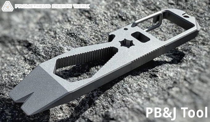Prometheus Design Werx, Inc. выпустили мультитул PB&J цельной титановой конструкции, совмещающий в себе девять функций, включая рычажный инструмент (мини-лом) и карабин для переноски. Вспомогательный инструмент Pry Bar & Jam имеет прочную конструкцию толщиной 6,35 мм из титанового сплава 6AL-4V с широким односторонним скосом кончика для рычажных работ, которые категорически запрещены (если иное не указано производителем) для клинков ножей. Центральная выемка на кончике предназначается для фиксации гвоздей и скрепок. Расширяющееся центральное отверстие с зубцами совместимо с различным крепежом метрического или SAE стандарта, а небольшое прямоугольное и расположенное сразу за ним - под газовые баллоны. В шестигранное слепое отверстие устанавливаются любые биты формата 1/4 или 6 мм. Загиб для открытия крышек соседствует рядом с противоскользящими выточками под руку, которые также можно использовать для получения древесной стружки. Крючок для крепления на экипировку, совмещенный с широким