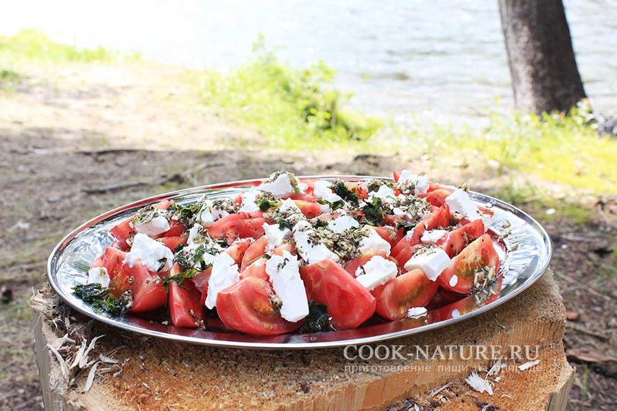 Если в поход взять пачку рассольного сыра типа фета, брынза, фетакса и т.п., можно прямо в середине водного похода (не думаю, что кто-то тащит помидоры в пеший!) приготовить очень простой, но и очень вкусный салат (или закуску) из помидоров! Рассольный сыр в вакуумной упаковке неплохо хранится, ну а как его можно применить для разнообразия Вашего походного стола – расскажет этот рецепт. Из чего будем готовить Рецепт помидоров с сыром Не знаю кто как, но мы, когда едем на сплав, стараемся брать как можно больше свежих овощей, особенно помидоров. Ранее, я уже рассказывал, как из помидоров и копченого сыра можно в походе приготовить вот такую закуску, сегодня мы продолжим эту тему! Представляю Вашему внимаю еще одно очень простое закусочное походное блюдо из томатов и рассольного сыра! Ну а для начала нам потребуется ножом мелко нарубить пять зубчиков чеснока, Должно получиться примерно вот так, как показано на этой фотографии. Конечно, если кто-то берет с собой на сплав терку или