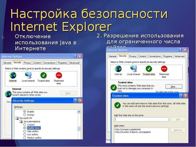 1. Откройте Internet Explorer. 2. Нажмите на значок шестеренки в правом верхнем углу. 3. Нажмите «Свойства обозревателя». 4. Откройте вкладку «Безопасность». 5. Нажмите значок «Надежные сайты». 6. Нажмите на поле «Сайты» сразу под зонами. 7. Введите IP-адрес устройства в верхнем окне, нажмите «Добавить», а затем «Закрыть». 8. Нажмите «Настраиваемый уровень ...». 9. Щелкните раскрывающийся список в нижней части этого окна и измените установка на «Низкий» 10. Нажмите «Сброс», а затем «Да» в диалоговом окне подтверждения. 11. Нажмите на вкладку «Дополнительно». 12. Убедитесь, что включено следующее: Просмотр-> Безопасность-> Разрешить запуск или установку программного обеспечения, даже если подпись недействительна. 13. Нажмите «Применить», а затем «ОК». 14. Перезагрузите компьютер и попробуйте получить доступ к вашей системе.