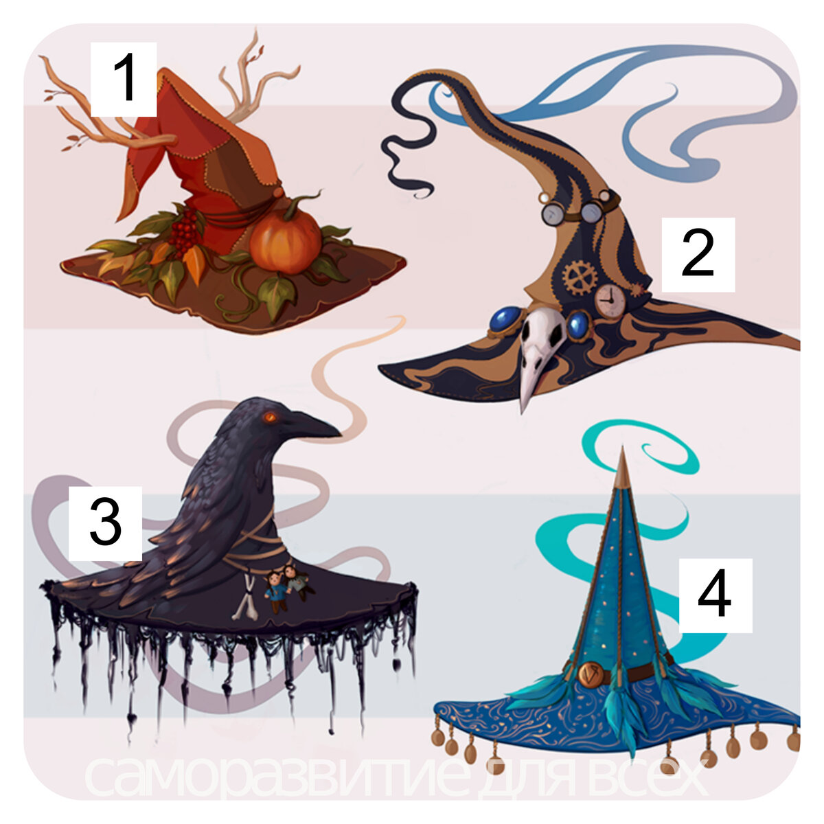 Выбери шляпу и узнай, какой бы ведьмой стала. Внимательно посмотри на картинку и читай толкование ниже. Обязательно делись результатом в комментариях! 1. Ведьма Полей. Вы любите природу и готовы трудиться в саду день и ночь, лишь бы увидеть результаты своих трудов. Обязательно поселились бы рядом с людьми, чтобы помогать им. Каждый выходной ставили лавку-палатку на местной ярмарке и продавали бы зелья, обереги, амулеты. Вас бы любили и почитали все жители. Любитель животных, как одомашненных, так и диких. 2. Ведьма Изобретательница. Не будь вы столь сильны, люди бы давно сожгли вас на костре за смелые эксперименты. Не гнушаетесь использовать селян для экспериментов. Для жилья выбрали бы уединенное место, где обязательно устроили лабораторию. Шестеренки, гайки, чертежи – ваша страсть! Но не всегда все работает как нужно, здесь уже поможет только магия. 3. Ведьма Тьмы. Вас боятся и уважают одновременно. Люди приносят вам дары только ради того, чтобы вы не трогали их. Поселились бы р
