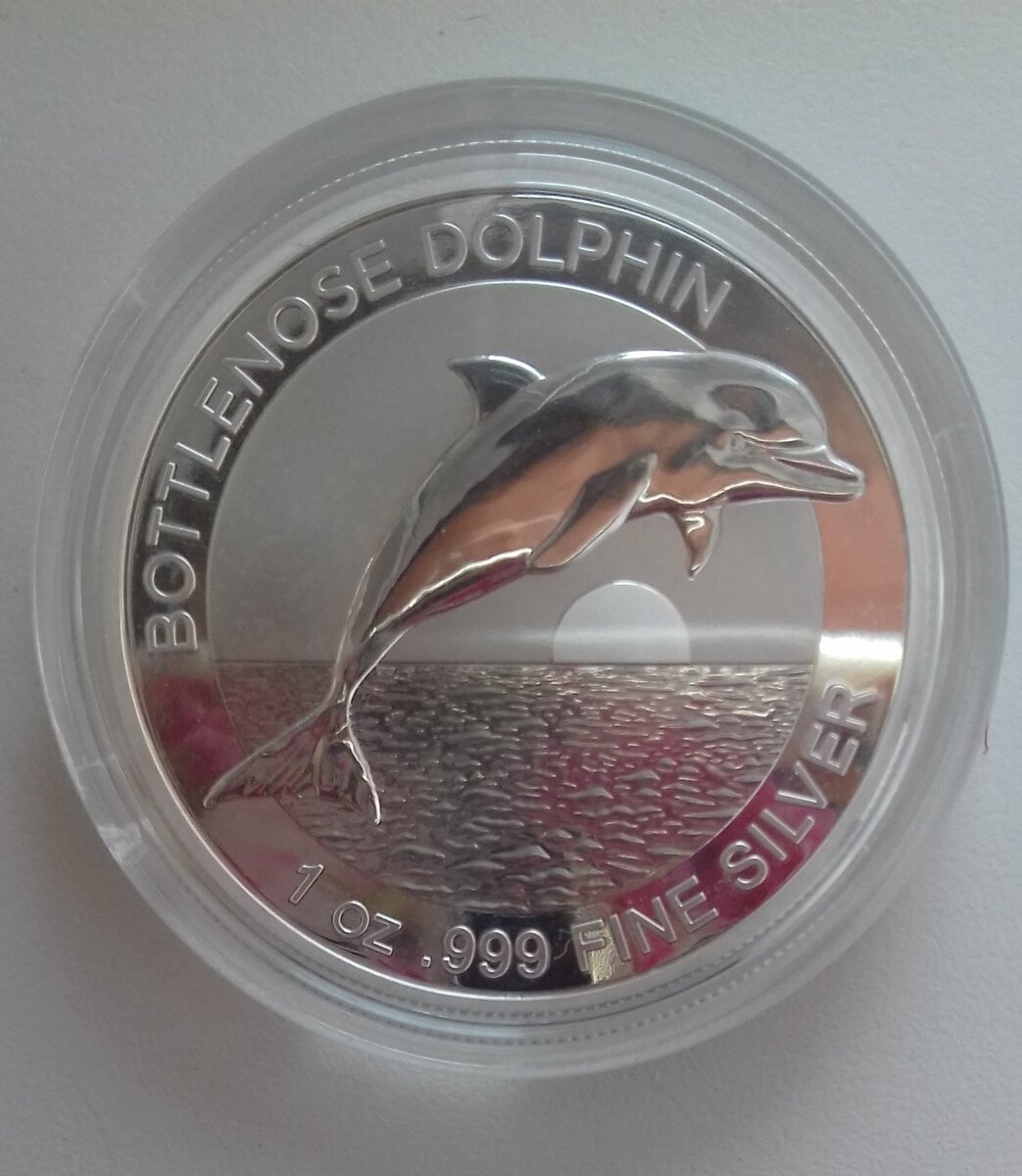 Всех приветствую дорогие читатели сегодня мне по почте пришла еще одна монета о которой я хочу рассказать, как раньше я и писал что я покупаю серебренные монеты что бы приумножить свои деньги покупаю каждый месяц по несколько монет на длительный срок Монета которая мне пришла сегодня выпущена австралийским монетным двором и это первая монета в этой серии дельфин афалина. Каждый год будет выходить по одной монете в этой серии и каждый раз дизайн монеты будет меняться что очень интересно коллекционировать. Монета вышла тиражом 25 тысяч штук по всему миру. Вот так выглядит монета Потрясающий дельфин афалин который выскакивает из океана на фоне восходящего солнца каждая. содержит 1 унцию серебра проба 999 монета поставляется в индивидуальной пластиковой капсуле Аверс изображение королевы Елизаветы второй год выпуска 2019 и номинал монеты один доллар Стоимость монеты Приобрел я эту монету за 2300 рублей монета вышла где то в феврале месяце пока еще не подорожала но это вопрос времени с
