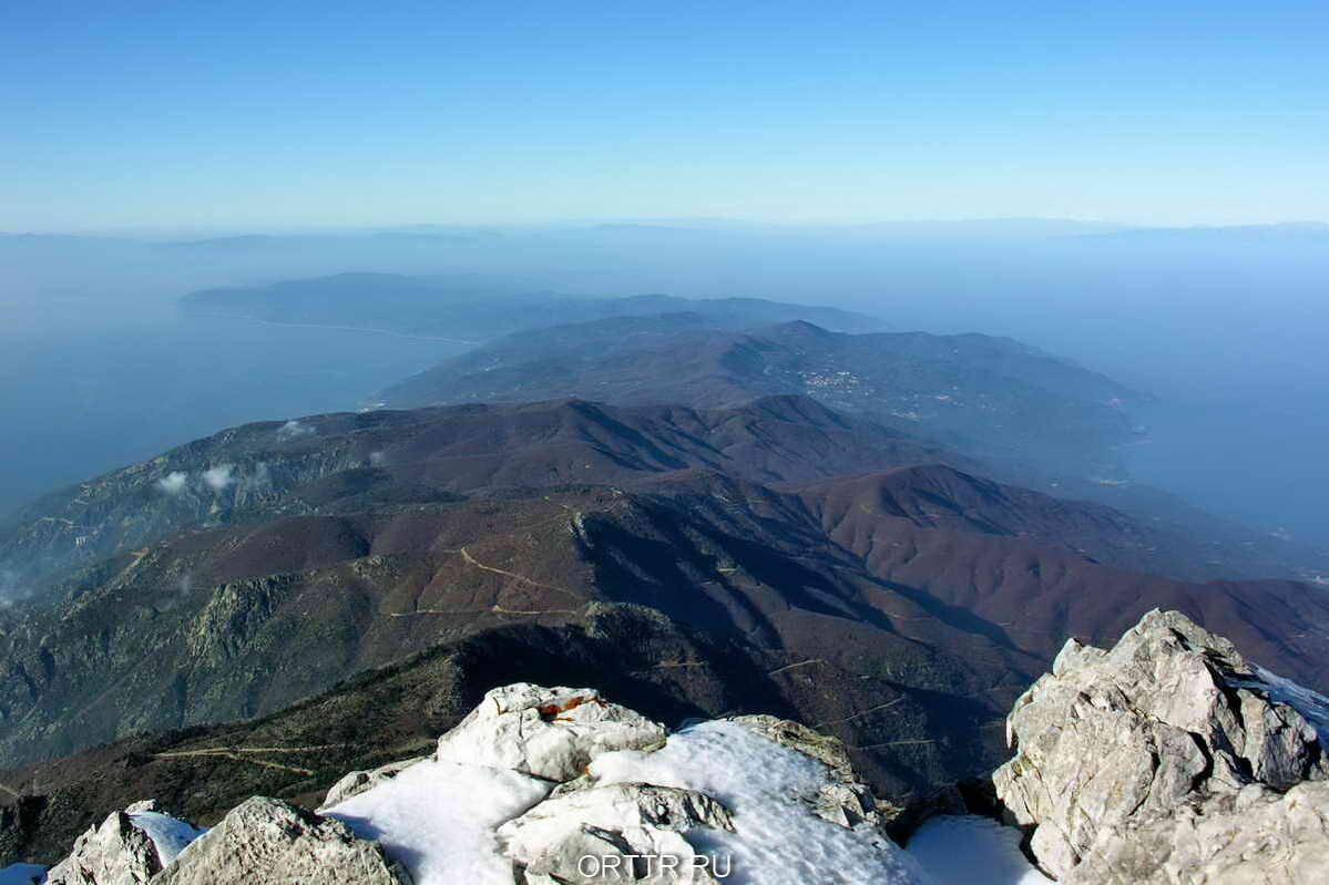 С северной стороны малой площадки вершины открывается вид на всю Святую Гору с ее хребтом, простирающимся от Малого Афона и Мегала Вигла. Видно, как замечал уже преподобный Афанасий Афонский, что Афон имеет форму креста. Далеко на северо-западе, за Солунским заливом, выступает снежная шапка горы Олимп, славившейся в древности, как и Афон, своими подвижниками и монастырями. Здесь же, на северных крутых склонах горы, растет неувядаемый «Богородичен цветок» — иммортель, с маленькими бело-розоватыми цветками, которые всегда очень ценились богомольцами как благословение Святой Горы. Многие монахи-смельчаки тут положили жизни свои, собирая этот цветок на гладких отвесных мраморных скалах над пропастью.