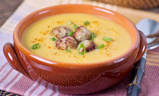 Такие супы очень вкусные и полезные для работы желудка. Любят их и вегетарианцы за возможность соединить в одном супе огромное количество разнообразных овощей. Как дополнение к супам-пюре можно подать гренки или сухарики, зелень или тертый сыр. Сегодня ми расскажем как приготовить восхитительный "Картофельный суп-пюре с чесночными фрикадельками" Для этого нам понадобиться: 1. Готовим обычный картофельный суп: картофель почистить, порезать как вам удобно, опустить в кипящую воду, через минут 5 добавить сушеный корень сельдерея.