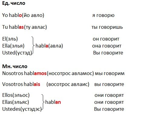 Если вы решили учить испанский язык, то мимо этой темы не пройти) Основой послужит знание особенностей личных местоимений испанского языка из этой статьи. Хотя все будет максимально просто. После прочтения статьи и небольшой тренировки с примерами испанский язык станет намного ближе. В испанском языке есть три основные группы глаголов (с окончаниями на -ar, -er, -ir). Начнем с глаголов на -ar на примере "hablar - говорить". При спряжении отбрасывается окончание инфинитива(-ar) и добавляются личные окончания глаголов. Поехали) Любой правильный глагол с окончанием -ar спрягается по этой схеме. просто меняем окончание. Закрепим с помощью глагола ayudar(аюдар)- помогать Yo ayudo Tu ayudas El(ella,Usted) ayuda Nosotros ayudamos Vosotros ayudais Ellos(ellas, Ustedes) ayudan Вот еще пять правильных глаголов с окончанием -ar для самостоятельной проработки по схеме выше: mirar(мирар)-смотреть, preguntar(прэгунтар)-спрашивать, pagar(пагар) - платить, tomar(тома