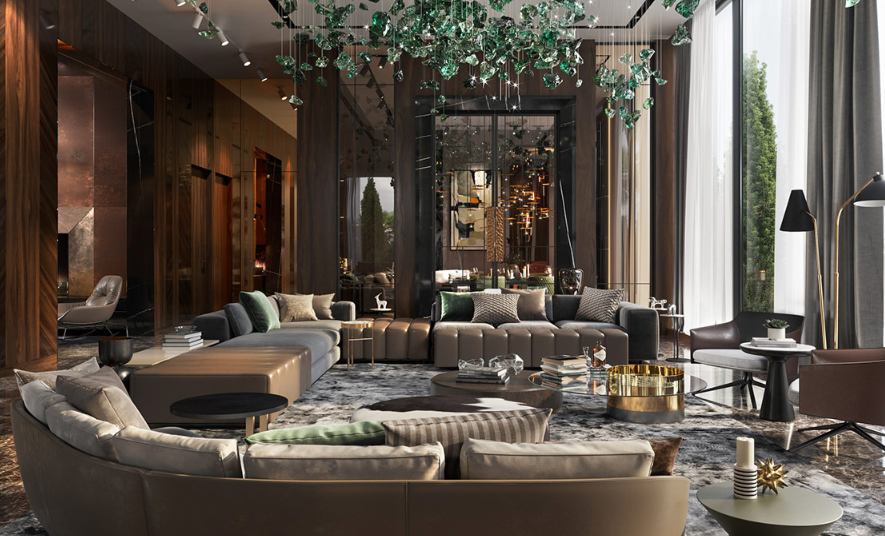 Сверху зеркального стола,стоящего возле дивана, блестит зеленая стеклянная чаша и коллекция золотых аксессуаров. Серия красиво декорированных элементов комнаты, делит огромную роскошную гостиную на различные секции для отдыха, развлечений и ужина.
