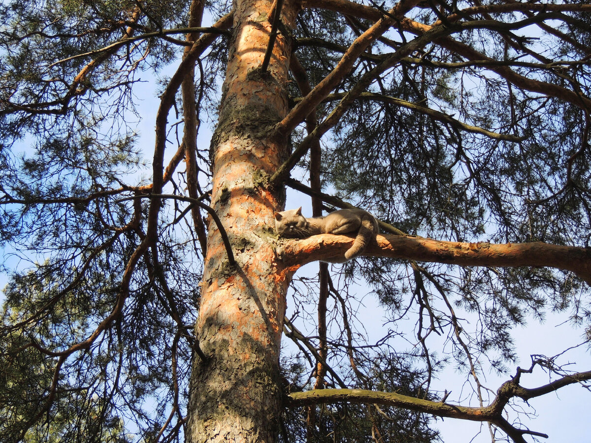 Этот случай произошёл в городе Всеволожске. Позвонил знакомый и говорит, что его кот уже вторые сутки сидит на высокой сосне. Ну, а так как я древолаз ещё тот, стало быть, мне его и снимать с дерева. Взял я когти свои титановые, пояс. Приезжаю, вижу такую картину. Сидит Британец шикарный на дереве. Хозяин говорит, наверное собак испугался. Подлез я к нему c мешком. В мешок за шкирку и вниз, он даже не пикнул и не пытался от меня дальше залезть на макушку. Вообщем, котик хороший оказался. В своей жизни я снимал 3-х котов с деревьев. Надеюсь, этот последний. С вами был Антон Корнеев. Предлагаю посмотреть следующий обзор, а именно мой чудо пересадчик растений, и как я им пересадил голубую ель.