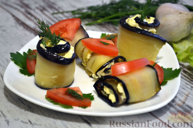 Привычные и необычные закуски, запеканка и даже выпечка. И всё с баклажанами! Салат из жареных баклажанов и помидоров, с сыром фета и грецкими орехами - замечательная лёгкая закуска на любой случай. Это абсолютная вкусовая гармония. Если любите и мясо, и баклажаны, возьмите на заметку рецепт мясной запеканки с баклажанами и помидорами, с аппетитной сырной корочкой. Запеканку можно готовить с любым мясным фаршем. Слоёные пирожки с сыром и запечёнными баклажанами - по мотивам израильских пирожков под названием "бурекасы". Слоеное тесто хрустит, горячий сыр внутри тянется... Еще больше вкуса добавляют баклажаны и семена кунжута. Баклажаны и сливы - необычное сочетание. Но если эти продукты объединить, получится очень оригинальная закуска из жареных баклажанов и слив, с начинкой из майонеза с чесноком, сыром и грецкими орехами. Украсить блюдо можно болгарским перцем. Более привычные и, наверняка, всем знакомые баклажанные рулетики. По этому рецепту начинка готовится из плавленого сыра и