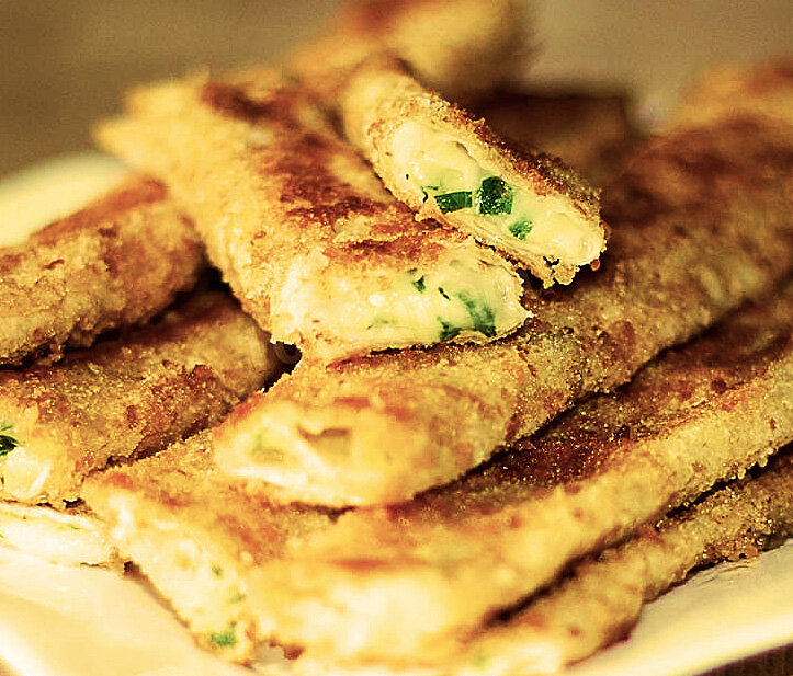 Здравствуйте сегодня мы приготовим закуску сырные палочки из лаваша. Для этого нам понадобиться сыр, свежая зелень, зубчик чеснока, яйцо, крахмал, панировочные сухари, масло подсолнечное для жарки и тонкий лаваш.Сначала делаем начинку для наших сырных палочек.Трем сыр выдавливаем в него зубчик чеснока, и мелко нарезанную свежую зелень и яйцо, затем делаем кляр из двух яиц и картофельного крахмала.Яйца взбиваем венчиком добавляем в них крахмал ,размешиваем чтобы получилось по консистенции как жидкая сметана. Далее режем лаваш вдоль на две части, ложечкой выкладываем на лаваш нашу начинку отступая от краев по 1 см, затем заворачиваем в трубочку и отрезаем, делаем так наши палочки пока не кончится лаваш.Насыпаем панировочные сухари в широкую тарелку обмакиваем палочки в кляре обваливаем в сухарях и выкладываем на разогретую сковороду. Обжариваем с двух сторон, достаем и наслаждаемся нашей закуской. Если понравилось мое повествование ставьте лайки, подписывайтесь и напишите в комментари