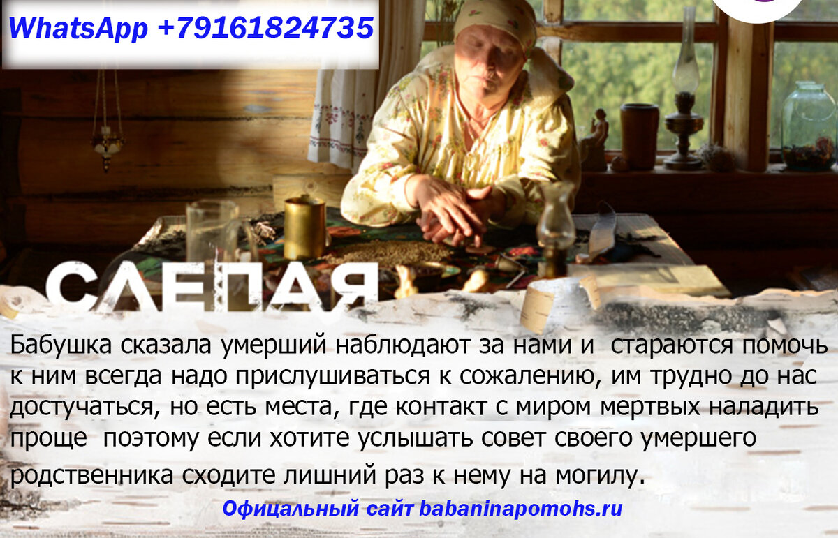 Вы можете обратиться за помощью напрямую к Бабе Нине по контактным данным Анны внучки Бабы Нины Viber +7 916 182 4735 WhatsApp +7 916 182 4735 Официальный сайт: https://babaninapomohs.ru/