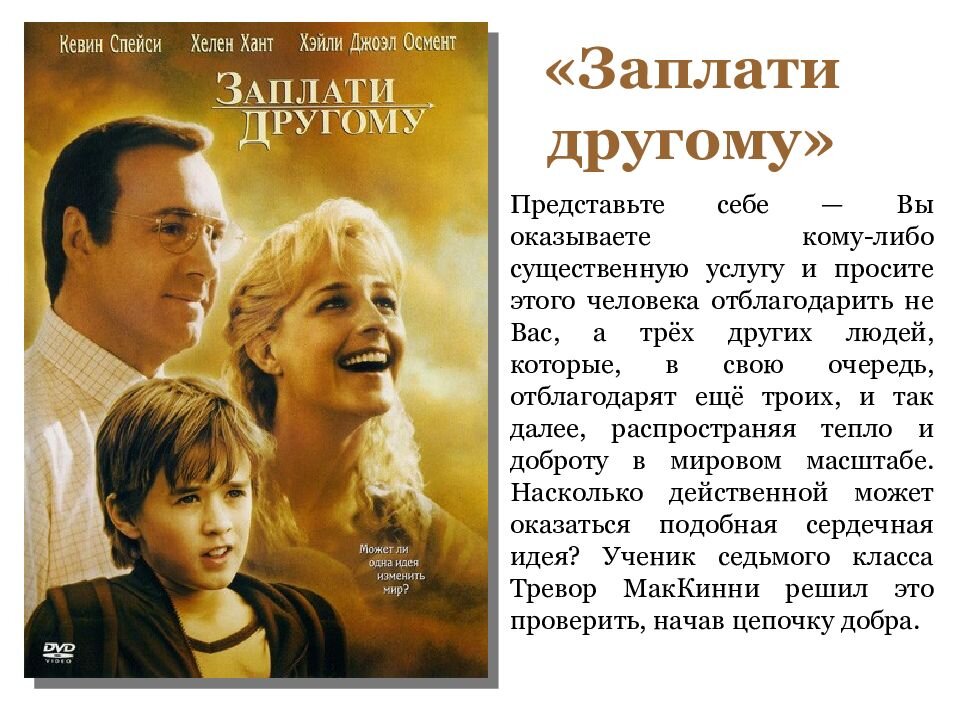 "Тревор Маккинни - обычный ученик седьмого класса. Но однажды, получив интересное задание от нового учителя по обществознанию, придумать, как изменить мир в лучшую сторону, Тревор с радостью делится своей идеей. Он придумал теорию о бескорыстной помощи трем незнакомым людям, а те в свою очередь помогут ещё трем людям передать добро и так дальше. Мальчик начинает воплощать свою теорию в жизнь, надеясь изменить мир и людей к лучшему". Мне очень понравилась идея Тревора! Вот он такой маленький, а как уже размышляет, как смотрит на жизнь и какие поступки совершает! Меня впечатляют его действия! Очень жаль, конечно, мне за его жизнь и детство, однако, э