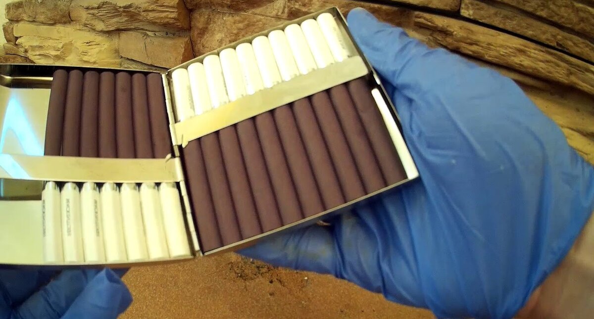 Сигареты имеют необычный окрас: оберточная бумага окрашена в тёмно-коричневый цвет, а фильтр белоснежный на 100%. На фильтре нанесена фирменная надпись Mackintosh. При распаковке сигарет, я огорчился, когда увидел мятые сигареты в количестве 3 штук. Их реально примяло в самом портсигаре. Выглядит это не эстетично. Я рассчитывал, что за стоимость сигарет, они завернут табак в настоящий табачный лист. Но не тут-то было.