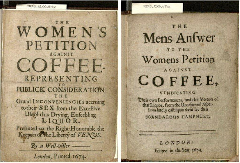 Жінки проти кави. У 1674 році лондонські кав'ярні придбали таку шалену популярність, що жінки, яким доступ туди був закритий, випустили Петицію протесту проти вживання чоловіками кава із заявою про необхідність закрити кав'ярні, оскільки їхні чоловіки просиджують у кав'ярнях цілими днями, забуваючи про свої подружні обов'язки. "Чому наші чоловіки витрачають свій час, обпалюють свої нутрощі і промотують гроші-і всього-то заради ковтка поганої, темної, густої, гіркої, огидної Бурди?» Чоловіки, в свою чергу, виступили на захист напою, стверджуючи, що кава, навпаки, позитивно впливає на їх організм, «додає їм сил», а ось у їхніх дружин погані характери і злі язики. У відповідь на петицію жінок вони опублікували чоловічу відповідь на жіночу петицію проти кави.