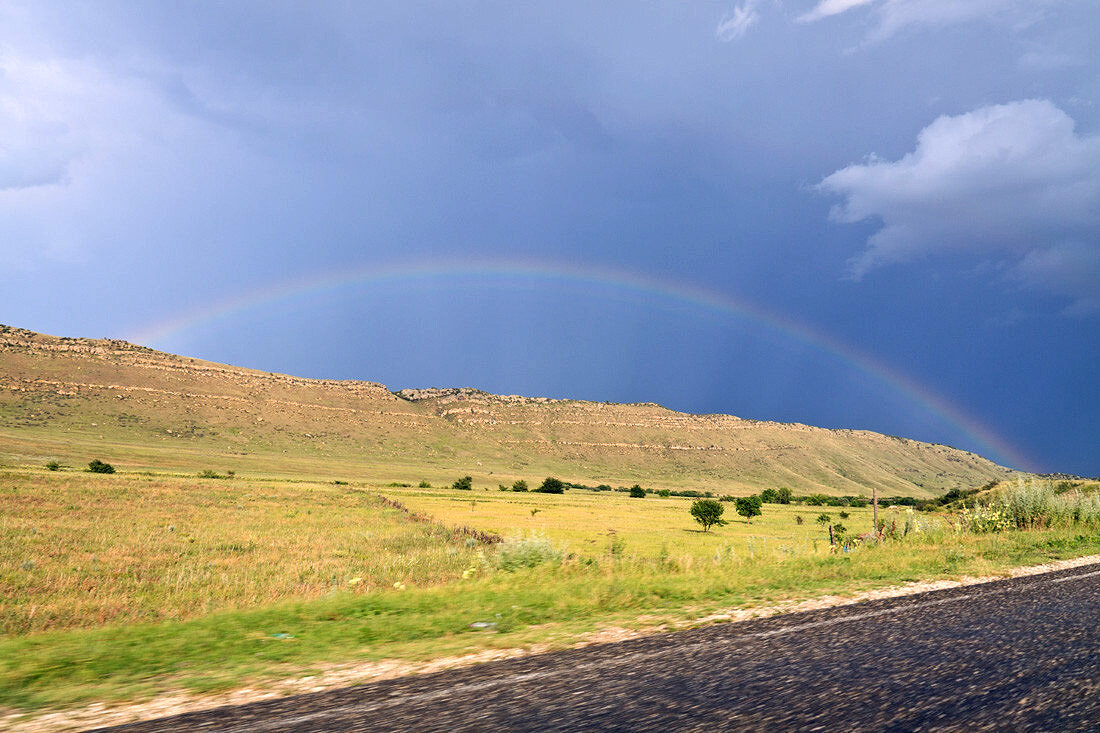 Прокатимся немного живописными дорогами Республики Дагестан. Дагестан - край чрезвычайно разнообразный, в том числе и в плане рельефа, но в первую очередь известен, как "горная страна". Именно так это название и переводится. И здешние дороги просто "взмывают" с отрицательных высотных отметок Прикаспийской низменности (уровень Каспийского моря ниже общемирового на 27 метров) до двух и более километров. А высшая точка - гора Базардюзю имеет высоту 4466 м. Так что дорога от жарких и солнечных пляжей Каспия до мест, откуда рукой подать до вечных снегов на вершинах Кавказа, может занять у вас всего каких-нибудь пару часов. Радуга над первыми предгорьями неподалёку от Махачкалы. Пока дорога хорошая и не такая ещё петляющая серпантинами, горы "растут" на глазах. Вскоре начинаются пейзажи не уступающие Швейцарии. Горы меняются буквально с каждой парой километров. Это, кажется, Левашинский район, хотя я не уверен. Плотина Гунибской ГЭС имени Расула Гамзатова и его строки на стене. Водохранилище
