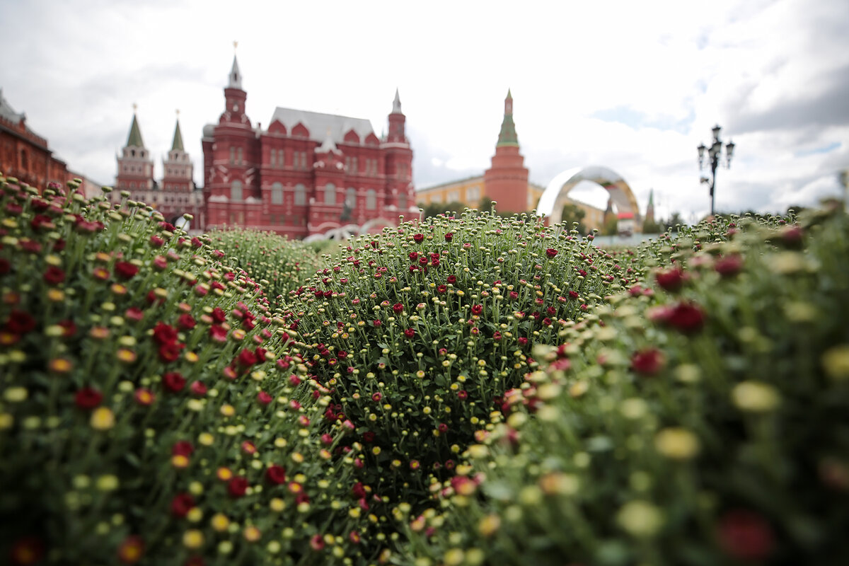На Манежной площади в рамках фестиваля "Цветочный джем" расцвел сад в виде гигантской карты ВДНХ из хризантем. Проект стал самым большим шоу-садом за всю историю фестиваля - на площади более 1000 м2 высажено почти 4 тысячи кустовых хризантем.