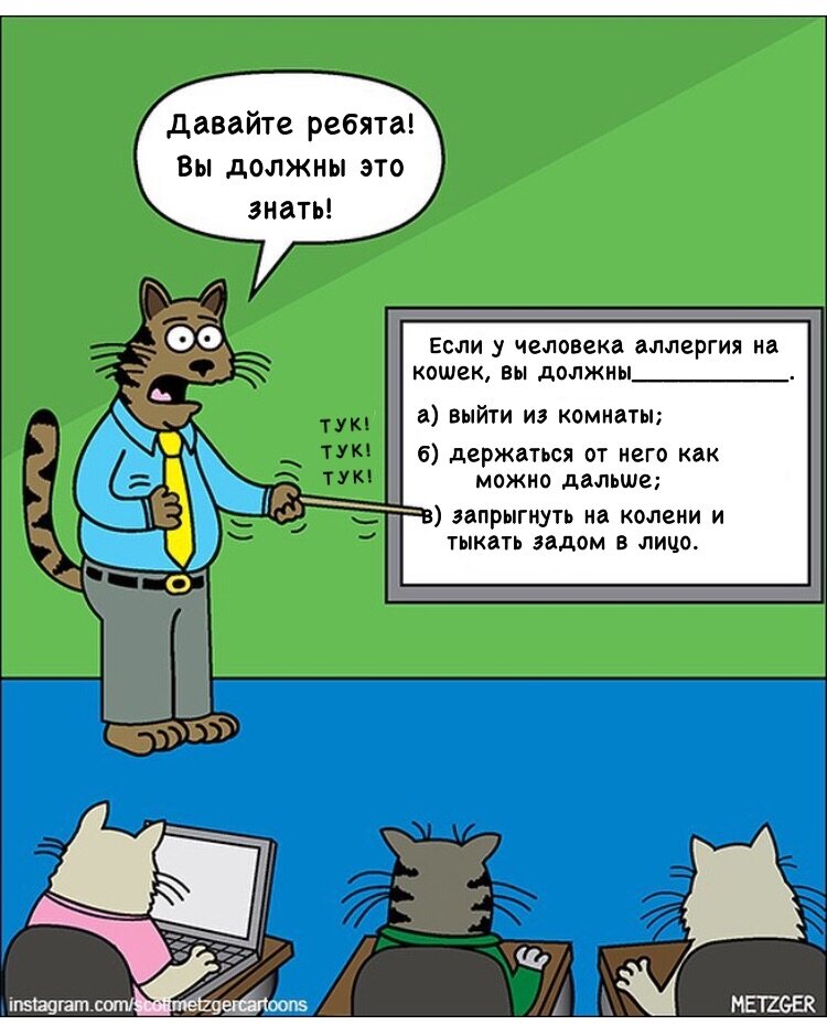 Художник из Калифорнии Scott Metzger рисует забавные комиксы о том, какой бы была жизнь животных, если бы они были людьми. Забавные комиксы о том, какой бы могла быть жизнь наших любимых котеек, если бы они эволюционировали вместе с нами: 1) 2) 3) 4) 5) 6) Источник: https://www.instagram.com/scottmetzgercartoons/ Перевод: ikalka Спасибо, за просмотр! 🤩 Если Вам понравилась публикация, то не забывайте ставить 👍, а ещё подписывайтесь на мой канал, здесь я буду публиковать комиксы с животными которые сама и перевожу. ✌🏻☺️
