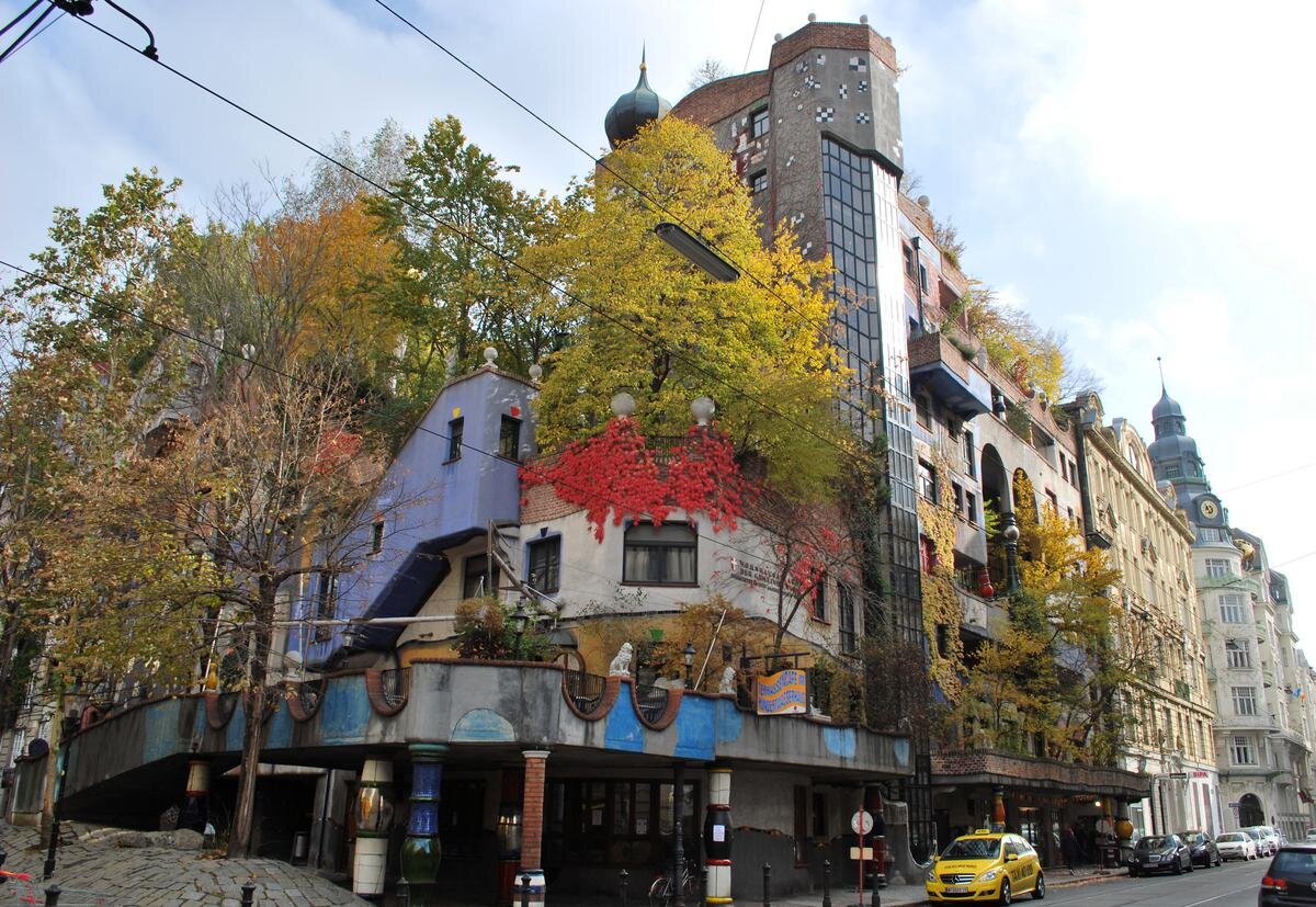 Уже один фасад этого дома в Вене, украшенный множеством яарких красок и цветной плиткой, привлекает взгляды прохожих. Те, кто живет в доме Хундертвассера, также имеют право проектировать фасад вокруг окон в соответствии с их собственным вкусом. Более 200 деревьев и кустарников на балконах и террасах на крыше превращают Хундертвассерхаус в зеленый оазис в центре города.