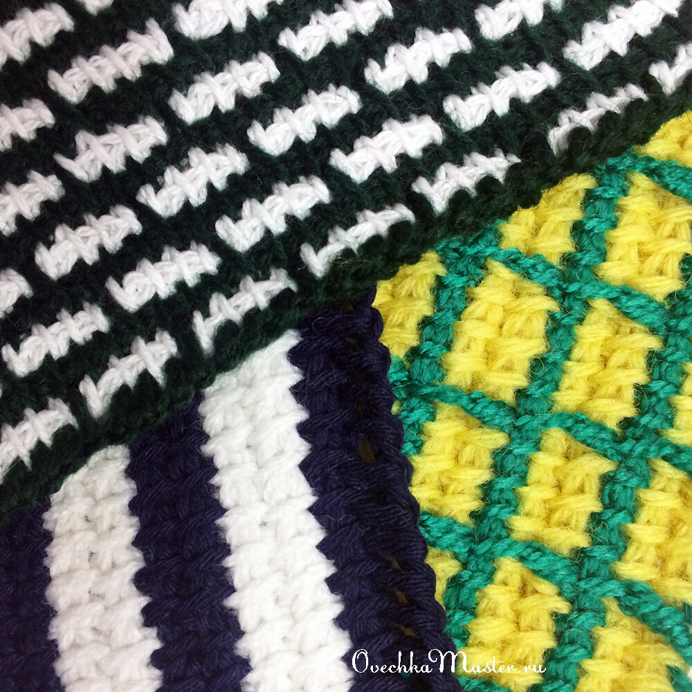 Всем добрый день. Продолжаю делать уроки по тунисскому вязанию. В планах еще несколько мастер-классов. Хочу показать не только узоры, но и, например, как вязать по кругу и другие приемы. А в этой статье я сделала подборку трех цветных узоров, которые мне очень нравятся. Первый узор - "Полосы". Этот узор выполняется простой тунисской вязкой. Цвет ниток меняется через каждые 4 ряда. Первый прямой ряд (синие нитки) - набираем петли. Второй обратный ряд (синие нитки) - провязываем простой вязкой слева направо. Третий прямой ряд (синие нитки) - снова набираем петли. Четвертый обратный ряд (синие нитки) - провязываем простой вязкой слева направо. Дальше меняем нитки на белые и вяжем аналогично 4 ряда. Второй узор - "Кирпичики". Первый прямой ряд (зеленые нитки) - набираем петли. Второй обратный ряд (зеленые нитки) - провязываем простой вязкой слева направо. Третий прямой ряд (белые нитки) - набираем петли. Четвертый обратный ряд (белые нитки) - провязываем простой вязкой слева напр