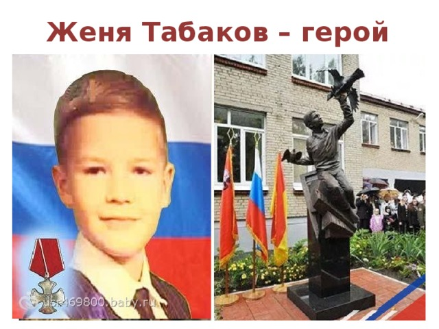Россия – великая держава, богатая героями не только среди взрослых. Дети в экстренных ситуациях, не задумываясь, проявляют героизм. Конечно, не все имеют звание Героя России. Помимо этого знака, страна награждает героев орденами Мужества, а также медалями «За спасение погибавших». Среди нас есть такие герои России нашего времени, и их подвиги знают и чтут в стране. Кто-то заслужил награду посмертно. Женя Табаков – герой России. Погиб в возрасте 7 лет. Спас свою сестру Яну, когда в дом ворвался грабитель. Яне удалось вырваться, а Женя получил восемь ножевых ранений, от которых скончался. Данил Садыков. 12-летний подросток, спас мальчика, который упал в фонтан и получил удар током. Данил не испугался, бросился за ним, успел его вытащить, но сам получил сильнейший разряд, отчего и скончался. Василий Жирков и Александр Мальцев. Подростки, получившие награды за спасение погибавших – тонувшей бабушки и ее восьмилетнего внука. Сергей Кривов – мальчик 11 лет. Спас тонувшего друга из вод