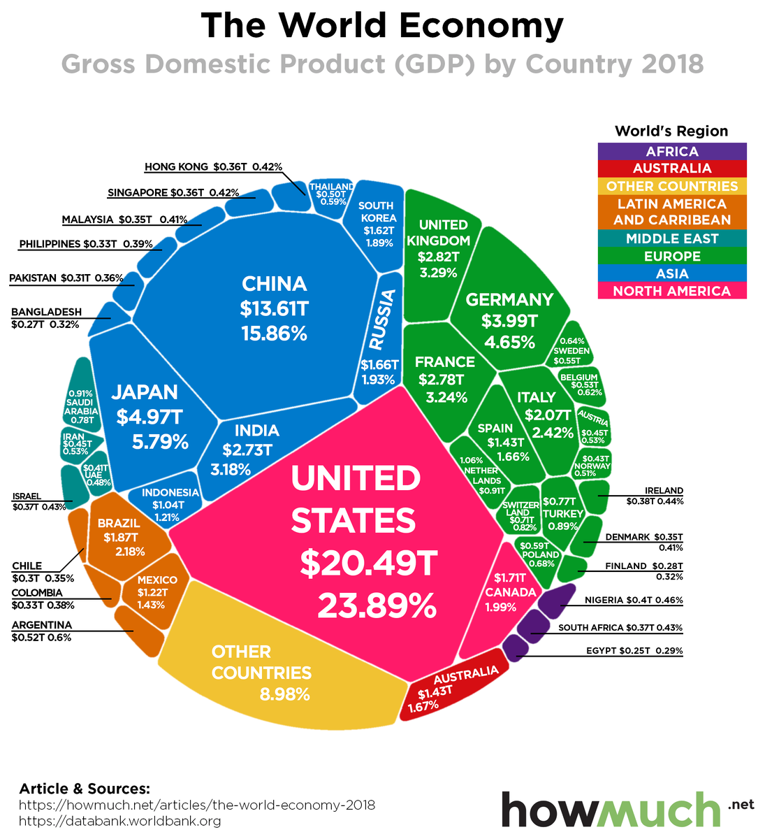 👨💻 Попалась на глаза обновленная статистика по росту глобальной экономики по версии Всемирного банка. По данным этой организации весь мир произвёл в 2018 году $86 трлн, что почти на 7% больше, чем в 2017 году. США по-прежнему удерживают лидерство с 23.9% мирового ВВП, при этом за год они выросли на 5,4%. Китай занимает почти 16% глобального ВВП, но показывает самые низкие темпы роста за 30 лет. 🧐В сумме обе страны занимают почти 40% общемирового ВВП, поэтому торговые войны и политические кризисы между этими странам так или иначе отражаются на всех рынках. К слову, о том, что нужно знать инвестору про ВВП можно прочитать на моем блоге (https://smfanton.ru/nuzhno-znat/vvp-na-dushu.html). Вот ТОП-5 стран мира по ВВП: 1️⃣ США - $20.49 триллион (23.9%) 2️⃣ Китай - $13.61 триллион (15.9%) 3️⃣ Япония - $4.97 триллион (5.8%) 4️⃣ Германия - $4 триллион (4.7%) 5️⃣ Великобритания - $2.83 триллион (3.3%) 🇷🇺 Где же Россия спросите вы?! Россия занимает лишь 11 строчку рейтинга с ВВП 1,